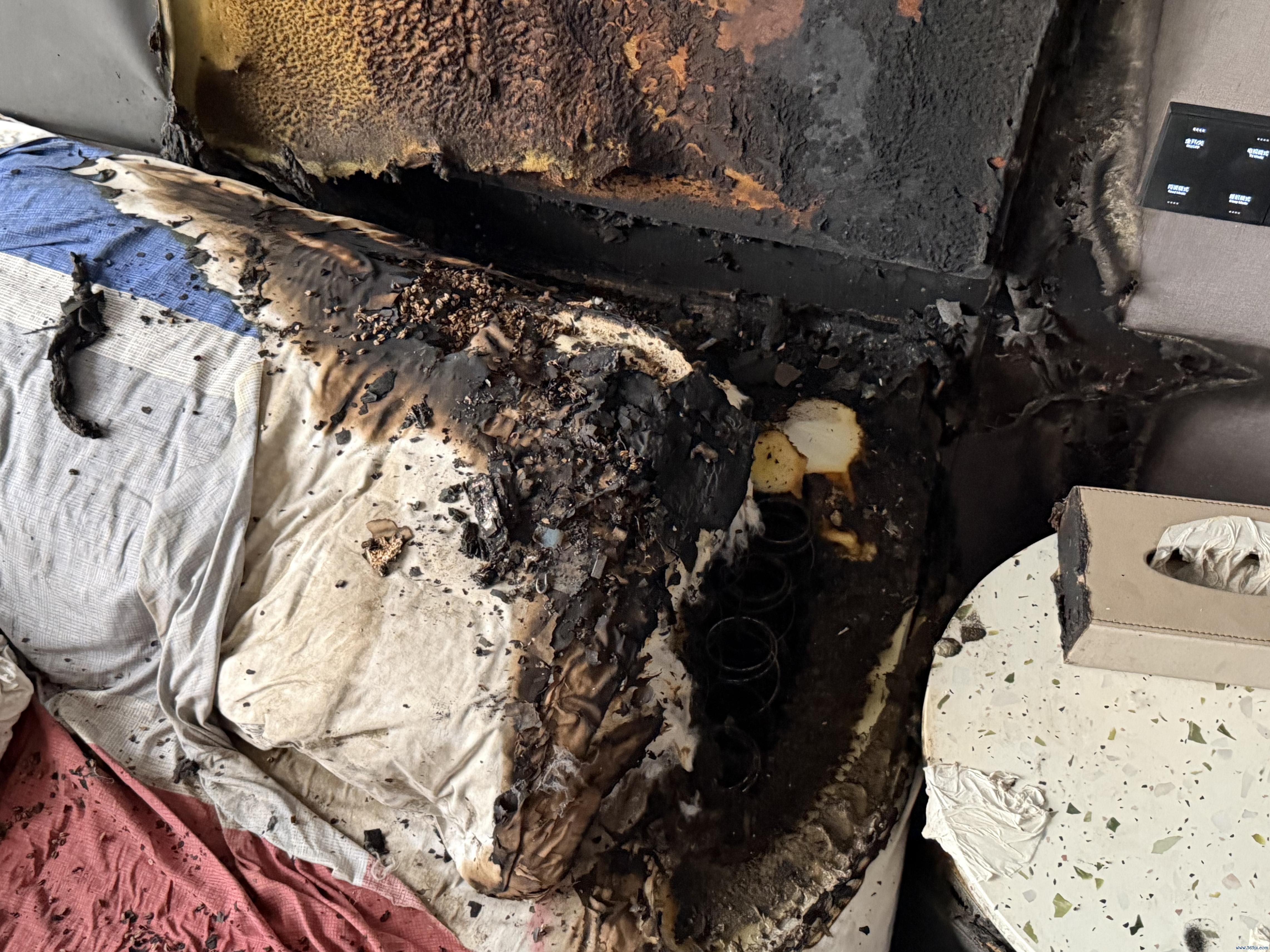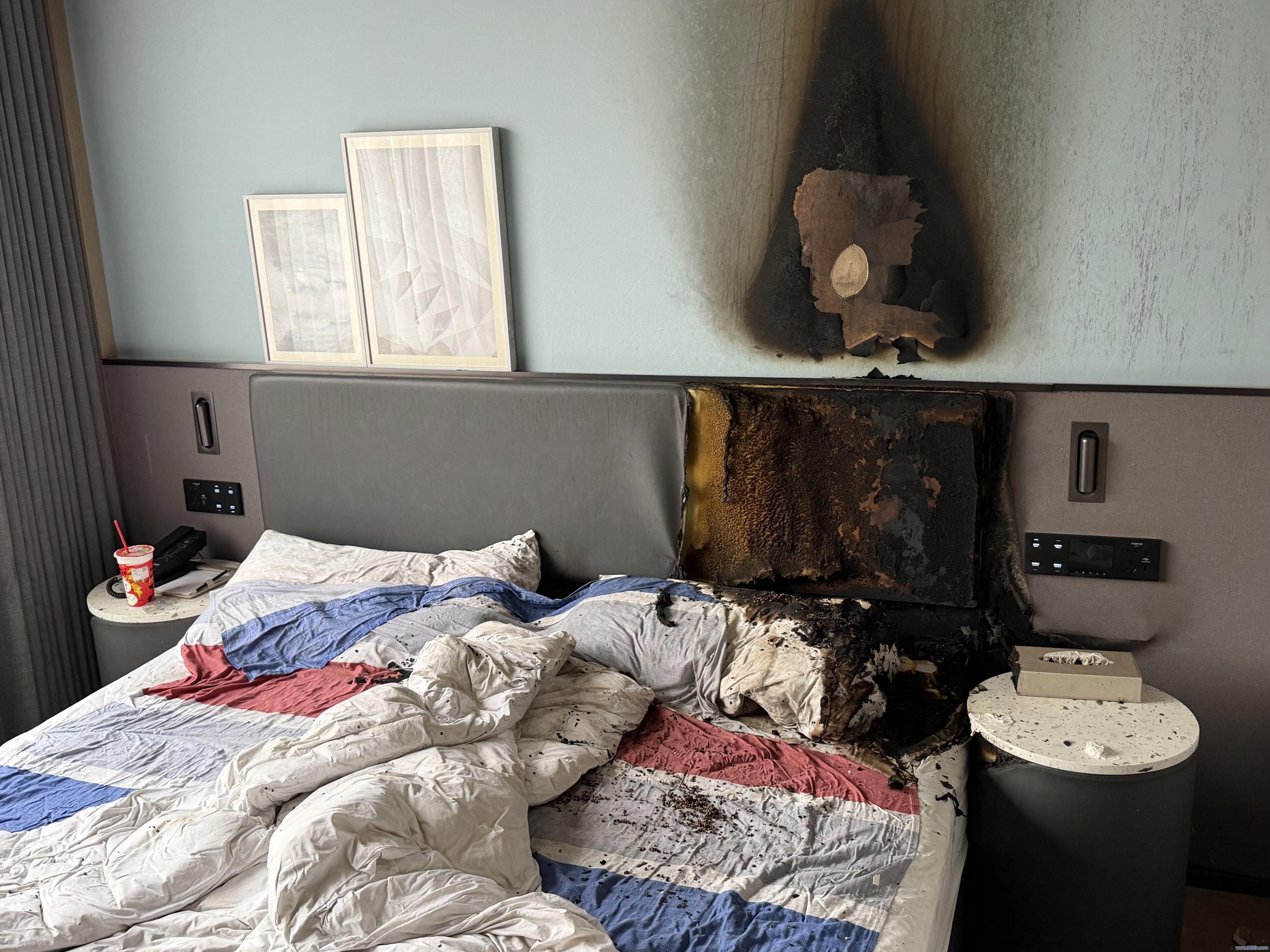 消防部门拜访初步认定,客房床头一块正在充电的充电宝激励失火。其中又名住客回忆,充电宝充电时被放在了枕头下。